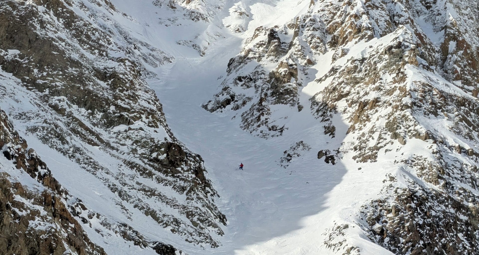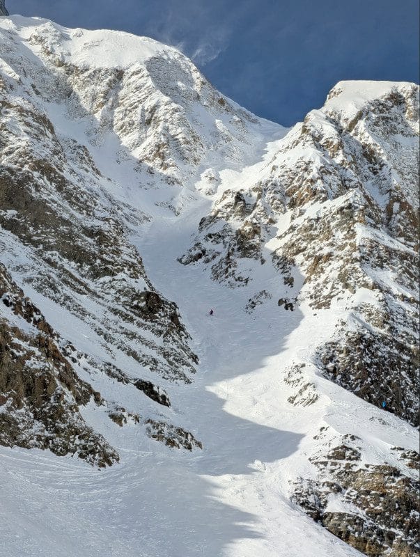 The Liberty Bowl was my personal nemesis of Big Sky. It’s the only single black way down from the Lone Peak. The first time I did it way back in 2017 I probably should have heeded the scary warning and just turned around and went down the tram. But I did not, and I got maybe a third of the way down before I full yard sale-d and slid a decent number of feet. In 2019 I felt far more prepared and still ate it at the icy entrance, sliding down the slick slope a number of feet again. They’re not joking when they say you should know how to self-arrest.